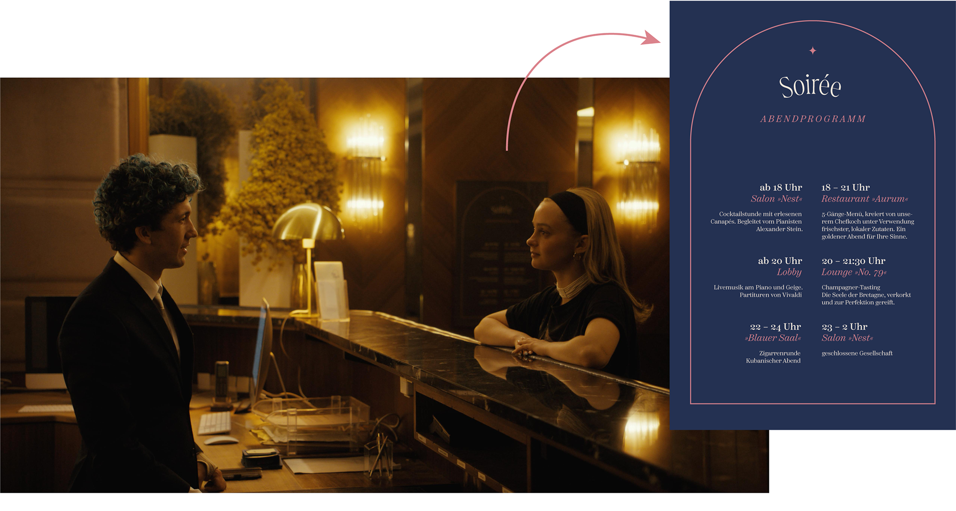 Für den Diplomfilm 2024/25 der Filmakademie Baden-Württemberg gestaltete ich, als Teil des Art Departments, diverse grafische Requisiten. Für das fiktiven Nobel-Hotel "The Flock" entwickelte ich das Corporate Design, zahlreiche Anwendungsprodukte, sowie Logo und Menükarten für das fiktive Delikatessen-Restaurant "cage d'or". Die Designsprache für "The Flock" orientiert sich an den organischen Formen der Hotel-Architektur, welche durch eine moderne, grafische Formensprache komplettiert wird und das Erscheinungsbild eines gehobenen, zeitgenössischen Etablissement prägt. Szenenbild: Felicitas Püls, Martha Inés Brenner Regie: Joscha Bongard Drehbuch: Joscha Bongard, Nicole Rüthers Kamera / DoP: Jakob Sinsel Produktion: LiseLotte Films GmbH, ZDF / Das kleine Fernsehspiel Premiere: Toronto International Film Festival 2025
